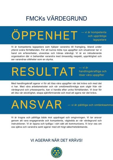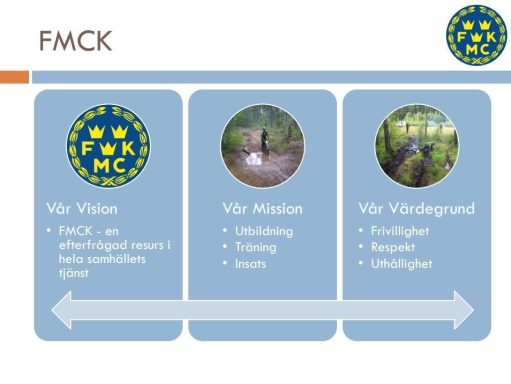 - FMCK skall kunna ställa medlemmar till samhällets förfogande vid insatser och katastrofer.